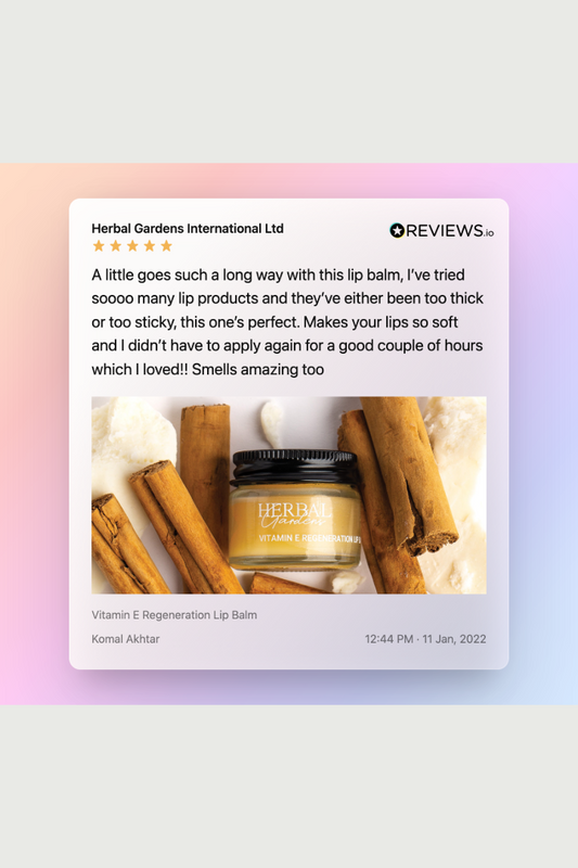 Sold out Sold outVitamin E Regeneration Lip BalmVitamin E Regeneration Lip Balm with Argan, Shea Butter, Cinnamon & Peppermint Regular price £6.00 GBPRegular priceUnit price / per£0.00 GBPSale price £6.00 GBPSold out